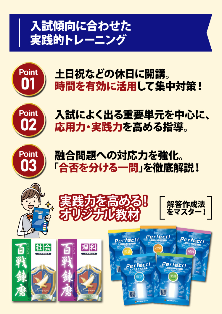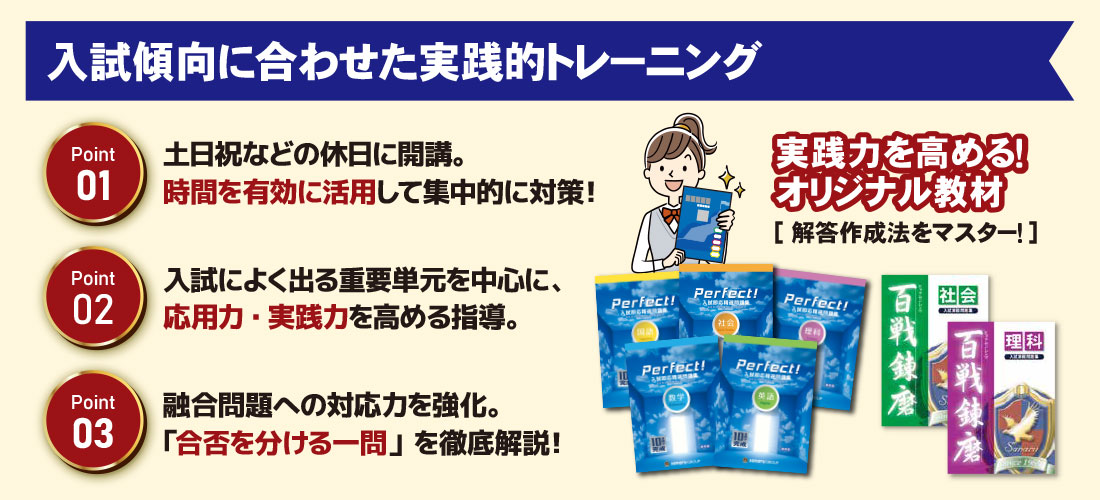 入試直前土日本科コース」では、土曜・日曜・祝日の昼間の時間を活用し、入試突破の鍵となる重要単元を中心に応用力・実践力を高める指導を行います。プロ教師による授業と各種テストの連携で、知識の穴を残さず、定着度を確認しながら本番に向けて万全の体制を作り上げます。