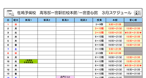 | 時間/曜日 | 月 | 火 | 水 | 木 | 金 | 土 | 日 |