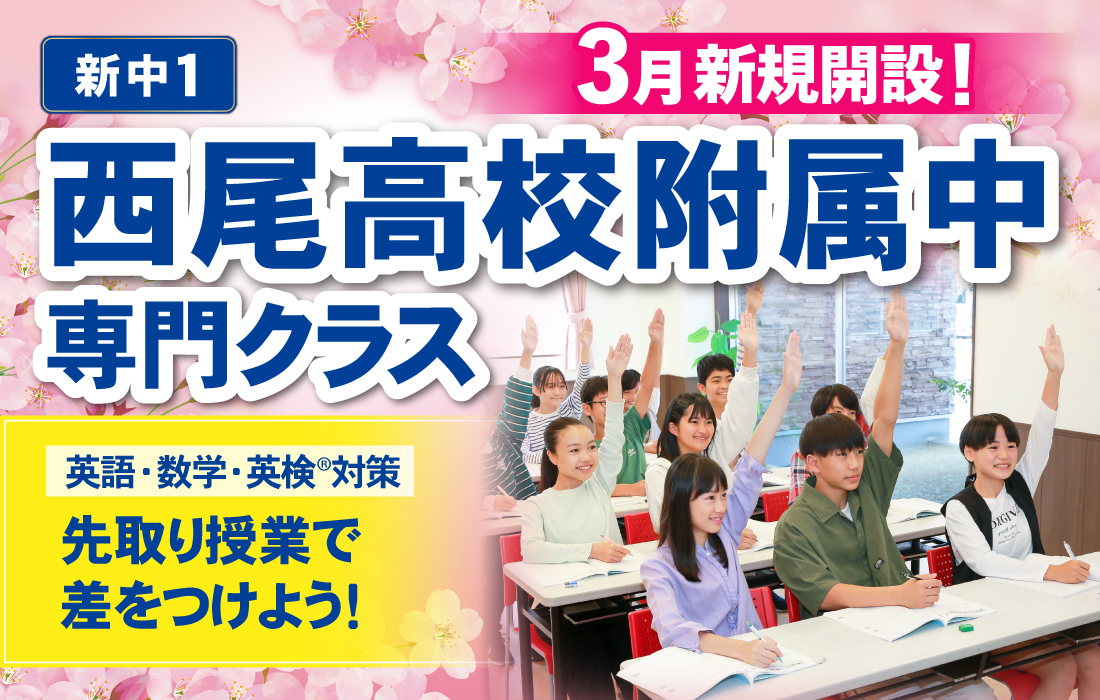 「西尾高校附属中専門クラス」では、英語・数学の先取学習と、英検®対策を行っていきます。特に、中・高校時代に大きな差がつく「英語・数学」の2科目を徹底的に鍛え上げ、将来の大学受験にも対応できる力を鍛えます。また、英検®目標級取得に向け、個々のレベルに合わせて合格まで導きます。